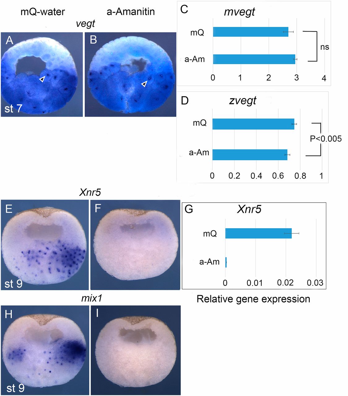 Fig. 6. Effect of α-amanitin on the expression of vegt, mix1, and Xnr5 mRNA in X. laevis embryos. milliQ-water or α-amanitin (100 pg per cell) were injected into each blastomere at the two-cell stage followed by in situ hybridization of hemibisected embryos or by RT-qPCR at the indicated stages. (A, E, and H) In situ hybridization of embryos treated with milliQ-water. (B, F, and I) In situ hybridization of embryos treated with α-amanitin. (C, D, and G) Relative gene expressions of mvegt, zvegt, and Xnr5 detected by RT-qPCR normalized by histone H4 expression. (AâD) vegt mRNA expression of st-7 embryos. (A and B) vegt mRNA in situ hybridization. (C) mvegt relative gene expression. (D) zvegt relative gene expression. (EâG) Xnr5 mRNA expression in st-9 embryos. (E and F) Xnr5 mRNA in situ hybridization. (G) Xnr5 relative gene expression. (H and I) mix1 mRNA expression of st-9 embryos detected by in situ hybridization. The data show the results of three independent experiments. Black arrowheads in A and B point to the accumulation of vegt transcripts around nuclei of vegetal blastomeres. a-Am, α-amanitin; mQ, milliQ water; ns, nonsignificant; P, statistics P value.