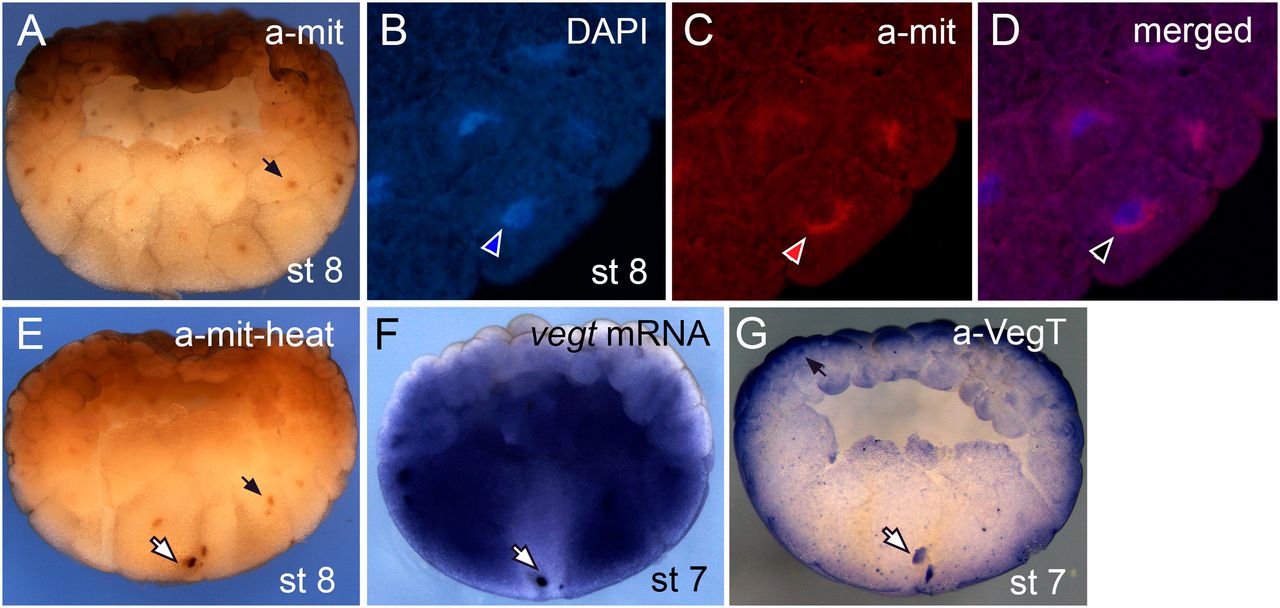 Fig. S4. Mitochondria and germ plasm identification in the X. laevis blastula. The immune detection methods are given in the SI Materials and Methods. The mitochondrial marker ab14730 (Abcam) was used for the immune detection of mitochondria. Incubation of embryos with only the secondary antibody gave negative results (not shown). (A) Immune detection of mitochondria without heat treatment in a hemibisected embryo. Mitochondria were detected inside blastomeres, likely around nuclei. (B) DAPI nuclear staining of a blastula section. (C) Immune fluorescent detection of mitochondria in the same section shown in B. (D) Merged B and C images indicates the localization of mitochondria around nuclei. (E) Immune localization of mitochondria in a hemibisected embryo after an overnight heat treatment at 65 °C in TE buffer, pH 9.0, as explained in the SI Materials and Methods. Mitochondria were detected around nuclei, and in vegetal islands, considered to be the germ plasm. Mitochondria associated with the germ plasm were not detected in embryos that did not receive the heat treament. (F) The germ plasm of a hemibisected embryo detected by the localization of vegt mRNA by in situ hybridization. (G) The germ plasm of a hemibisected embryo detected by the localization of VegT protein by immune localization with anti-VegT. Black arrows point to mitochondria around cell nuclei. White arrows indicate the germ plasm. Blue arrowhead points to a DAPI-stained nucleus. Red arrowhead signals the mitochondria around the nucleus. Black arrowhead signals the merged image of the nucleus surrounded by mitochondria. a-mit, anti-mitochondria treatment without heat treatment; a-mit-heat, antimitochondria treatment after heat treatment; a-VegT, anti-VegT treatment.