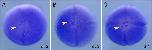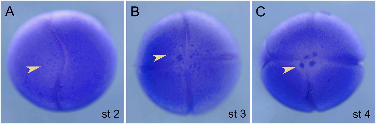 Fig. S5. Vegetal views of X. laevis embryos after vegt mRNA in situ hybridization. Arrowheads point to vegt mRNA localization in the germ plasm islands of the vegetal pole. (A) Two-cell stage embryo. (B) Four-cell stage embryo. (C) Eight-cell stage embryo.