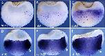 Fig. S3. mix1 mRNA localization in X. laevis embryos. The animal hemisphere is oriented toward the top, and the dorsal side is oriented to the right. Embryos were dorsally hemibisected before in situ hybridization. (AâC) Blastulae. (DâF) Gastrulae. White arrowheads mark the position of the dorsal blastopore lip.