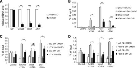 Figure 2. Dynamic occupancy of KMT2D complex and H3K4me3 at the enhancer regions of Notch target genes. pre-T cells were treated for 24 h with GSI or with DMSO (control). (A) qRT-PCR showing the downregulation of the Notch target genes Gm266, Hes1 and Dtx1 in presence of GSI (black bars). Data were normalized to the housekeeping gene GusB (glucuronidase β). Shown is the mean ± SD of triplicate experiments ([***] P < 0.001, unpaired Student's t-test). (B) ChIP experiments reveal Notch-dependent changing levels of the positive histone mark H3K4me3. (C and D) Recruitment of the KMT2D complex components UTX (C) and RbBP5 (D) decline after GSI treatment. Data were normalized to the positive control (GAPDH TSS) and in the case of H3K4me3 (B), data were further normalized to histone H3 (see Supplementary Figure S2D). Shown is the mean ± SD of triplicate experiments ([NS] not significant, *P < 0.05, **P < 0.01, ***P < 0.001, unpaired Student's t-test). |