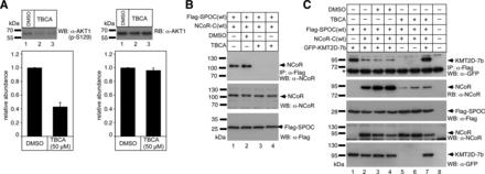 Figure 7. Inhibition of Casein Kinase 2β (CK2β) restores the association of KMT2D with the SPOC domain of SHARP. (A) Phosphorylation of AKT1 serine 129 (p-S129) is decreased upon CK2β inhibition by TBCA (left). HEK 293 cells were treated with DMSO (lane 1) or TBCA (lanes 2 and 3) for 3 h prior to cell lysis. p-S129 of AKT1 was tested by Western blotting. The pan-AKT1 antibody (right) served as loading control. A densitometric analysis from four independent experiments is shown in the lower panels. (B) Inhibition of CK2β activity by TBCA (lanes 3 and 4) abolishes the SPOC(wt)/NCoR(wt) interaction. (C) The C-terminal GFP- KMT2D-7b fragment coimmunoprecipitates with Flag-SPOC(wt) (upper panel, lane 1). The KMT2D-7b/SPOC(wt) interaction is reduced after coexpression of NCoR-C(wt) (1942–2453, upper panel, lanes 2, 3 and 4). The SPOC(wt)/NCoR-C(wt) interaction can be verified by reblotting (RB) with an anti-NCoR antibody (RB: α-NCoR). CK2β inhibition by TBCA reduces the SPOC(wt)/NCoR-C(wt) interaction (RB: α-NCoR, lanes 5, 6 and 7) and restores the KMT2D-7b/SPOC(wt) interaction (upper panel, compare lanes 3, and 4 with lane 7). HEK293 cells were transfected with the indicated expression constructs for Flag-SPOC(wt), GFP-KMT2D-7b, and NCoR-C(wt). Expression was verified by Western blotting (panels WB: α-Flag, α-NCoR and α-GFP). The asterisk denotes the heavy chain of the antibody used for immunoprecipitation. |