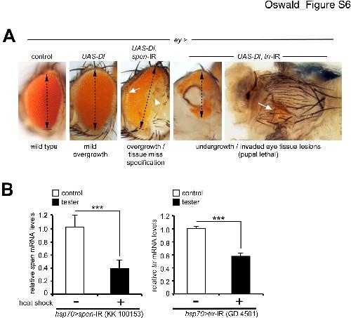 Figure S6. Eye-specific depletion of Spen/SHARP and Trr/KMT2D combined with Notch hyperactivation and efficiency of the RNAi constructs. (A) When the Notch ligand Delta is overexpressed in the early developing eye using the ey-Gal4 (ey>) driver, this results in a mild eye overgrowth in adult flies (10). Depleting spen in this sensitized background resulted in 100% hyperplastic growth (visible as eye tissue folds, white arrow head) and eye miss-specification (white arrow). Conversely, depleting trr/KMT2D, led to eye undergrowth. Intriguingly, many animals showed additionally invaded eye tissue lesions in the thorax (white arrow) and/or abdomen (not shown). (B) Knock down efficiency of the RNAi transgenic lines against spen and trr was evaluated by quantitative PCR (qRT-PCR). spen and trr mRNA levels were normalized to rp49 in late third instar larvae expressing RNAi against the indicated genes using the temperature inducible system hsp-70-Gal4 (hsp-70>, one hour heat shock at 37ºC followed by one hour at 25ºC). After one hour of RNAi induction, mRNA levels of spen were reduced to approximately 60% and trr levels by 40%. Data were analyzed by a two-tailed unpaired t-test ([***] P < 0.001): values represent the mean ± SD of three independent replicates for hsp70>spen-RNAi (KK100153), hsp70>trr-RNAi (and respective controls non-heat shocked hsp-70> and tub>). |