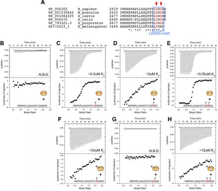 Figure 4. The SPOC domain of SHARP interacts with the corepressor NCoR in a phospho-dependent manner. (A) Sequence alignment of the NCoR C-termini from Homo sapiens, Mus musculus, Xenopus laevis, Danio rerio, and Strongylocentrotus purpuratus. The conserved LSD-motif is highlighted by a blue box, phospho-serines are highlighted with red arrows. (B–H) Shown are representative thermograms (raw heat signal and nonlinear least squares fit to the integrated data) for wildtype and mutant (R3552A/R3554A) SPOC proteins (represented in the figure as SPOC and SPOC mut, respectively) binding to phosphorylated and unphosphorylated NCoR peptides. The NCoR peptides used in each experiment and their affinity (Kd) for SPOC are shown. N.B.D. = no binding detected. (B) SPOC does not interact with the unphosphorylated NCoR peptide. (C and D) SPOC displays modest affinity for the two singly phosphorylated NCoR peptides. (E) SPOC binds the doubly phosphorylated NCoR peptide with high affinity. (F–H) The SPOC mutant (R3552A/R3554A) has significantly reduced affinity for the NCoR phosphopeptides. Forty titrations were performed per experiment, consisting of 7μl injections that were spaced 120 seconds apart. Complete thermodynamic binding parameters for each experiment are shown in Supplementary Table S3. |