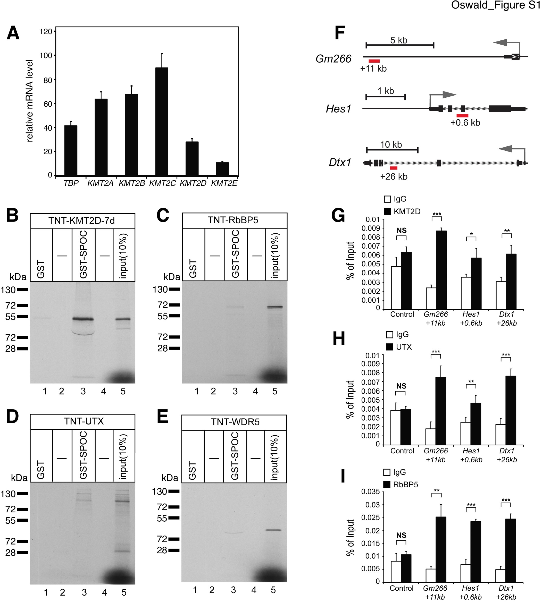 Figure S1. The KMT2D complex at enhancers of Notch target genes and interactions of KMT2D-complex components with the SPOC-domain of SHARP. (A) Relative expression levels of KMT2- family members and TBP mRNA in preT (Beko) cells. (B, C, D, E) GST-SPOC interacts strongly with cell free synthesized and 35S labeled KMT2D fragment (KMT2D-7b) (B), but not with cell free synthesized and 35S labeled RbBP5 (C), UTX (D) or WDR5 (E). (F) Notch-1 and RBP-J Chip-Seq data (accession# GSE29600) were analyzed in order to identify the enhancers of the Notch target genes Gm266, Hes1 and Dtx1, which respectively localize to +11kb, +0.6kb and +26kb regions relative to the transcription start sites (TSSs, grey arrows). Red boxes indicate the enhancer regions where our analysis was focused on. (G, H, I) ChIP experiments showing the occupancy of KMT2D (G), UTX (H) and RbBP5 (I), subunits of the KMT2D complex, at the enhancer regions of Gm266, Hes1 and Dtx1 Notch target genes. Shown are raw data represented as mean ± SD ([NS] not significant, [*] P < 0.05, [**] P < 0.01, [***] P < 0.001, unpaired Student’s t-test). |
