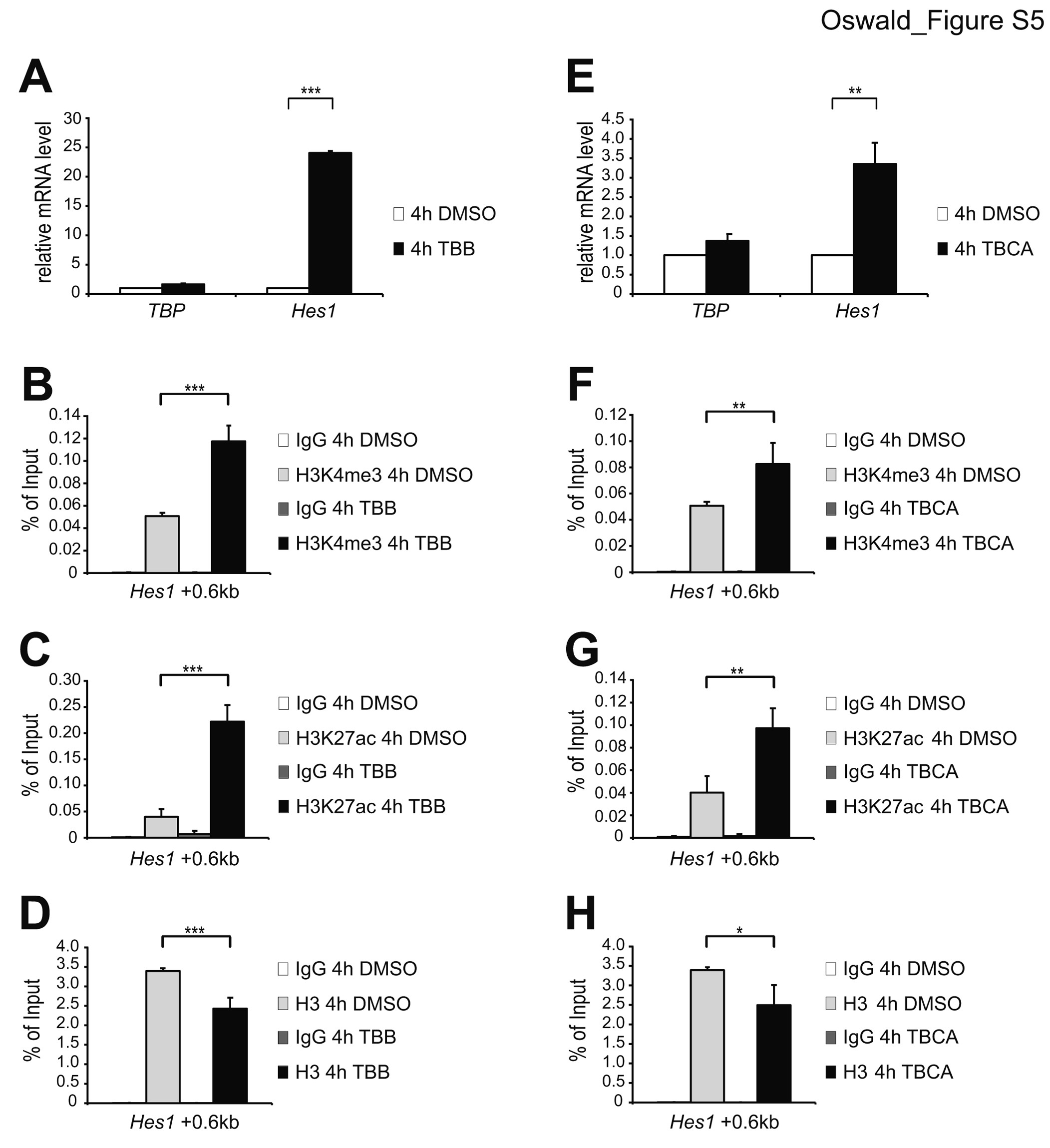 Figure S5. Inhibition of Casein Kinase 2 (CK2β) results in upregulation of Hes1 Notch target gene. (A) Mature T-cells were treated for 4 hours with 25 μM TBB or with DMSO as control and total RNA was purified and analyzed by qRT-PCR. Data were normalized to the housekeeping gene GusB (glucuronidase β). Shown is the mean ± SD of one representative experiment measured three times ([***] P <0.001, unpaired Student’s t-test). (B and C) As measured by ChIP, inhibition of Casein Kinase 2 (CK2β) by TBB in mature T-cells results in increased levels of (B) H3K4me3 and (C) H3K27ac at the Notch-dependent enhancer of Hes1 Notch target gene. (D) As revealed by ChIP using a pan H3 antibody, nucleosome occupancy is reduced at the enhancer of Hes1 Notch target gene upon TBB treatment in mature T-cells. Data were normalized to GAPDH 0kb and further normalized to histone H3. Shown is the mean ± SD of duplicate experiments measured twice each ([***] P < 0.001, unpaired Student’s t-test). (E) Mature T-cells were treated for 4 hours with 25 μM TBCA or with DMSO as control and total RNA was purified and analyzed by qRT-PCR. Data were normalized to the housekeeping gene GusB (glucuronidase β). Shown is the mean ± SD of one representative experiment measured three times ([**] P <0.01, unpaired Student’s t-test). (F and G) As measured by ChIP, inhibition of Casein Kinase 2 (CK2β) by TBCA in mature T-cells results in increased levels of (F) H3K4me3 and (G) H3K27ac at the Notch-dependent enhancer of Hes1 Notch target gene. (H) As revealed by ChIP using a pan H3 antibody, nucleosome occupancy is reduced at the enhancer of Hes1 Notch target gene upon TBCA treatment in mature T-cells. Data were normalized to GAPDH 0kb and further normalized to histone H3. Shown is the mean ± SD of duplicate experiments measured twice each ([*] P < 0.05, [**] P < 0.01, unpaired Student’s t-test). |