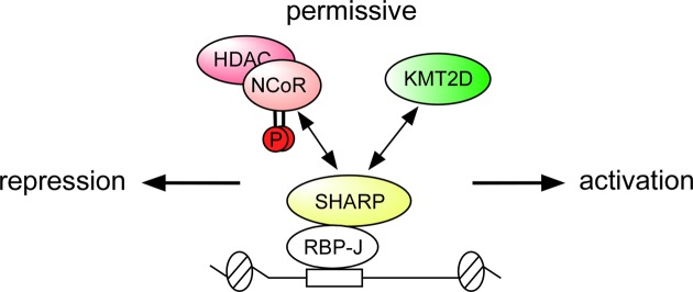 Figure 9. Model for the competing NCoR- and KMT2D-complex at Notch target genes. To keep an intermediate/permissive chromatin state, the RBP-J/SHARP complex recruits either activating KMT2D or repressing phospho-NCoR/HDAC complexes. The phospho-dependent competition between the two opposing chromatin modulators allows the incorporation of incoming signaling inputs to regulate Notch target genes responsiveness in the absence of Notch. The SHARP/NCoR interaction moves the balance versus the repressed state whereas the SHARP/KMT2D complex moves the balance versus the active state waiting for being displaced by NICD/p300. |