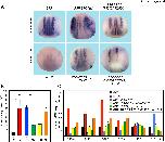 Figure S4. Wildtype RBP-SPOC, but not mutant RBP-SPOC, interferes with neurogenesis in Xenopus laevis embryos. (A, B) Injection of Notch-1δE (N1δE) mRNA, a dominant active form of Notch, results in loss of primary neurogenesis (lower panel, left) compared to the GFP control (upper panel, left), as observed by loss of N-tubulin (tubb2b) staining in Xenopus embryos at stage 16 (S16). In contrast, injection of RBP-SPOC(wt) mRNA leads to an increase in primary neurons (upper panel, middle). This phenotype can be rescued by coinjection of N1δE (lower panel, middle). The mutant RBP-SPOC (R3552A/R3554A) shows no effect on primary neurogenesis (upper panel, right) and only a modest loss of primary neurons after coinjection with N1δE (lower panel, right). Numbers of injected embryos and phenotypes are listed in Supplementary Table 2. (C) Injection of Notch-1δE (N1δE, red bars) results in upregulation of Notch target genes (hes5.1, hes5.2, hey1 and hes4) and downregulation of N-Tubulin (tubb2b) as also monitored by whole mount in situ hybridization for tubb2 (A and B). Injection of RBP-SPOC(wt) (blue bars) results in the downregulation of Notch target genes and the upregulation of N-tubulin, which is rescued by coinjection of N1δE (green bars). Injection of RBP-SPOC (R3552A/R3554A) showed no effect on the expression of Notch target genes and N-tubulin (yellow bars). Coinjection of N1δE with RBP-SPOC (R3552A/R3554A) resulted in a mild upregulation of target genes and downregulation of N-tubulin (orange bars). Mean values and standard error of the mean (error bars) based on three experiments are shown. For panel B: N = total number of embryos anaylzed, n = number of independent embryo batches analyzed. |