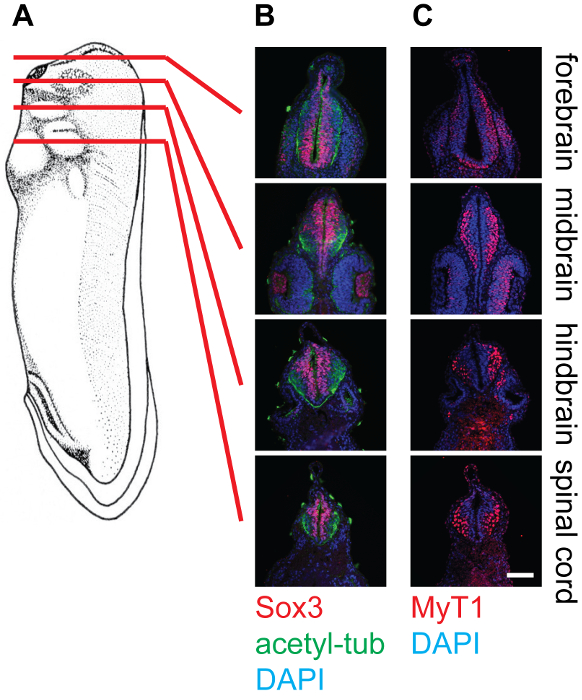 Figure 4: Cross-section of stage 30 X. laevis tadpoles and staining in the neural tissue, 20X. (A) Schematics indicating the relative positions (forebrain, midbrain, hindbrain, and spinal cord) of section planes on Xenopus tadpoles. (B) Corresponding cross-sections stained with anti-Sox3 (Red), anti-acetylated-tubulin (Green), and DAPI (Blue), showing the relative locations of neural stem cell pools as well as neurofilaments within the neural tube. (C) Corresponding cross-sections stained with anti-MyT1 (Red) and DAPI (Blue), showing the relative locations of differentiated primary neurons within the neural tube. Scale bar = 20 µm.