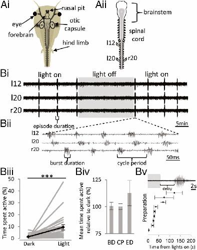 Fig. 1. Fictive locomotion in prometamorphic X. laevis larvae is sensitive to light. (A, i) Cartoon of stage 56 larva showing the approximate location of the central nervous system. (A, ii) Schematic depicting preparation with glass suction electrodes on ventral motor roots. (B, i) Extracellular record from three ventral motor roots showing spontaneous episodes of fictive locomotion. (B, ii) Expanded time base to show coordination of spontaneous rhythm and various parameters, including burst duration (BD), cycle period (CP), and episode duration (ED). Spontaneous activity is sensitive to ambient light levels. In the light, episodes of activity occur regularly every few minutes, whereas in the dark (gray box) the preparation falls silent. (B, iii) Graph of time spent active in light and dark, expressed as a percentage of total recording period, for 23 larval preparations (light-gray lines). The population mean is shown in black. (B, iv) Other parameters of fictive motor activity are unaffected; BD (n = 18), CP (n = 16), and ED (n = 23) are expressed as mean percentage in light relative to dark. (B, v) Graph of mean latency to motor activity from nine different preparations where at least three transitions between dark and light were recorded. In each example, the latency to activity was measured following 10 min in the dark. (Upper) Example response from a stage 54 larva following 10 min in the dark (gray box). Error bars represent ±SEM; ***P < 0.01. |