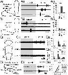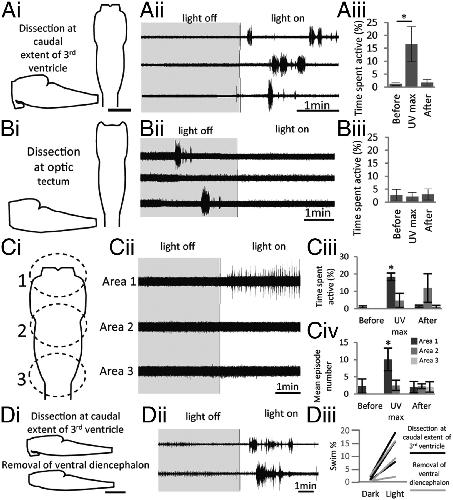 Fig. 3. Photosensitive tissue resides within the caudal diencephalon. (A, i) Schematic of the dissection performed: The forebrain is removed apart from a small portion of diencephalon caudal to the dorsal opening of the third ventricle. Both dorsal and sagittal aspects are depicted. (Scale bar, 200 µm.) (A, ii) Ventral root recording from a stage 54 larva showing three consecutive responses to illumination with UV light (400 nm; 39 lx). (A, iii) Graph of average data comparing time spent active 200 s before, during, and after illumination (n = 7). (B, i) Schematic illustrating the dissection made flush with the optic tectum to completely remove the diencephalon. (B, ii and iii) Equivalent data to A displayed for preparations lacking the diencephalon (n = 4). (C, i) Schematic illustrating the approximate location of focal illumination of three areas of isolated nervous system. (C, ii) Sequence of responses to illumination of these different areas with UV light following 10 min in the dark (gray box). (C, iii and iv) Graphs showing average data for time spent active (C, iii) and mean episode number (C, iv) for illumination of each area; comparison of 200 s before, during, and after illumination are plotted (n = 4). (D, i) Schematic illustrating isolated nervous system before (Upper) and after (Lower) removal of the ventral diencephalon containing the hypothalamus and pituitary. (D, ii) Ventral root recording from a stage 56 larva before (Upper) and after (Lower) the dissection was performed. (D, iii) Graph illustrating data from three different preparations. Swim % is shown both before (black line) and after (gray lines) removal of the ventral diencephalon. Error bars represent ±SEM; *P < 0.05. |