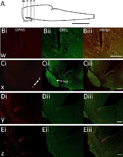 Fig. S3. OPN5 and CRY1 are expressed throughout the nervous system. (A) Schematic of a Xenopus tadpole brain showing the approximate position of sections taken for imaging. (BâE) Immunohistochemistry showing OPN5 and CRY1 expression within the ventral half of the preparation at three distinct anatomical levels moving caudally from the region of light sensitivity. d, dorsal; v, ventral. (C, ii) CRY1 is strongly expressed within the hypothalamus (hyp), the region surgically removed in Fig. 3D, without loss of light sensitivity. [Scale bars, 200 μm (A) and 100 μm (BâE).] |