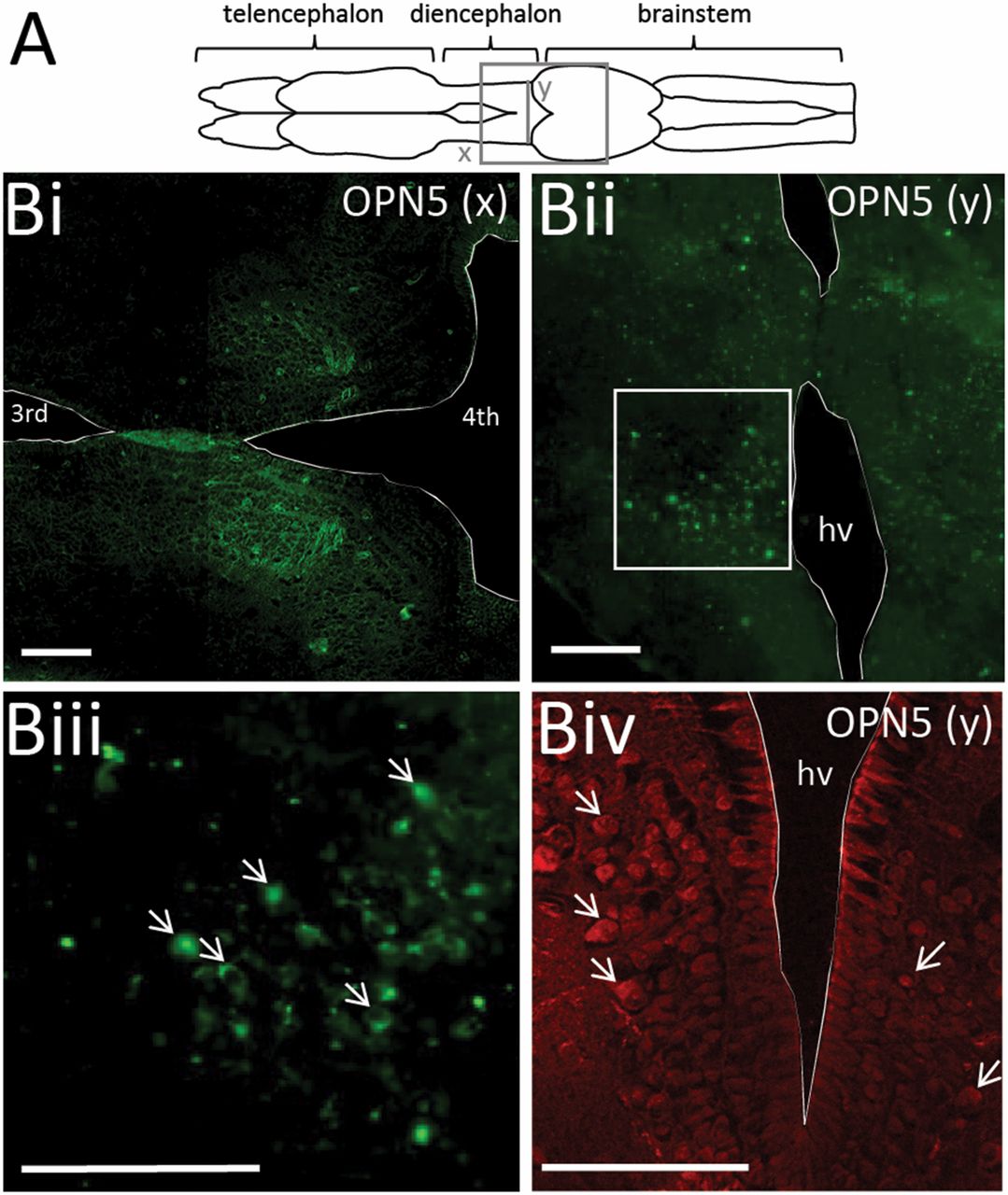 Fig. 4. UV-sensitive proteins are located within the tadpole caudal diencephalon. (A) Schematic of a Xenopus tadpole brain showing the approximate position of sections taken for imaging. (B) OPN5-positive neurons within the caudal diencephalon of a stage 55 tadpole. (B, ii) A cluster of neurons is located in the ventral half of the diencephalon in proximity to the hypothalamic ventricle (hv); expanded view of the boxed area (B, iii) and a second more ventral image from a different preparation (B, iv). Examples of neuron cell bodies at arrows in B, iii and B, iv. (Scale bars, 100 μm.) |