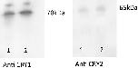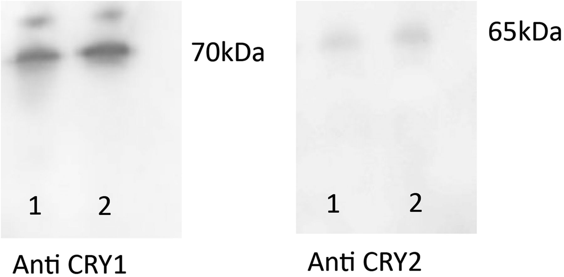 Fig. S7. Western blots for the detection of CRY1 and CRY2 in Xenopus samples. Stage 51 (lane 1) and adult (lane 2) Xenopus protein samples were run on 4â12% polyacrylamide gels and transferred to nitrocellulose membrane for Western blotting to detect CRY1 or CRY2 using a commercially sourced antibody (Aviva Systems Biology; 1:5,000 for CRY1 and 1:1,000 for CRY2). Positive bands at â¼70 and 65 kDa were obtained for both samples. This result revealed that the antibody specifically detected proteins of the correct size for Xenopus cryptochromes. |