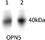 Fig. S5. Western blot for OPN5 detection in X. laevis protein samples. Stage 51 (lane 1) and adult (lane 2) Xenopus protein samples were run on 4â12% polyacrylamide gels and transferred to nitrocellulose membrane for Western blotting to detect OPN5 using the antibody described above at 1:5,000. Positive bands at â¼40 kDa were obtained for both samples. This finding revealed that the antibody specifically detected a protein of the correct size for Xenopus OPN5. |
