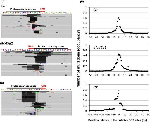 Figure 2. Amplicon sequencing analysis of on-target sites in founder animals. (A) Representative Integrative Genomics Viewer (IGV) images at each target site. Deletions, insertions and base substitutions are indicated by black, purple and other four color (red, blue, green and ocher) bars, respectively. (B) Positions of mutations at the tyr, slc45a2 and ltk target sites. The horizontal and vertical axes indicate the relative positions from the predicted cut site, 3 bp upstream of protospacer-adjacent motifs (PAMs) and the occupancy rate of mutant alleles to the total reads at each base position, respectively. The number of mutations was counted by IGV tools. |