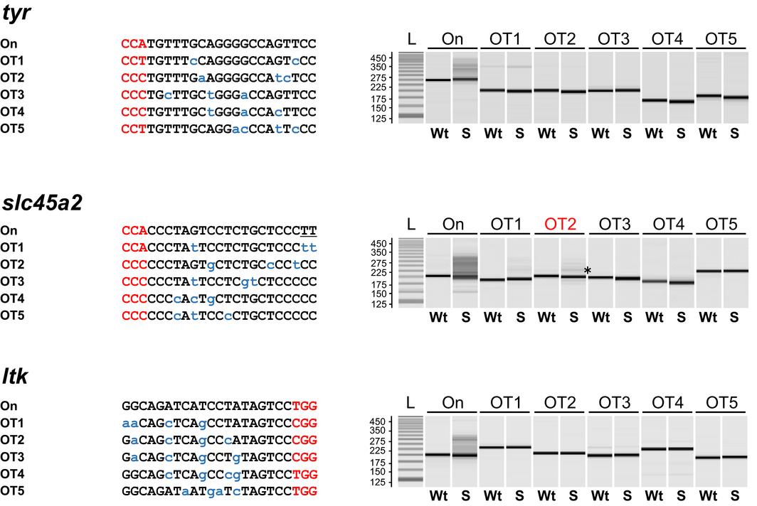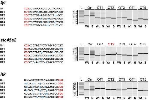 Figure 6. Detection of off-target activity by heteroduplex mobility assay (HMA). (Left) Putative off-target sequences of tyr, slc45a2 and ltk are aligned below the on-targets. The protospacer-adjacent motif (PAM) sequences and mismatch bases are shown as red and blue-small characters, respectively. (Right) Gel images converted from electropherograms of five off-target sites of each gene analyzed by HMA. On and OT mean on-target and off-target sites, respectively. Note that sgRNA targeting slc45a2 has two mismatches at the 5â² of the protospacer sequence (underscored). An asterisk in slc45a2 OT2 indicates a faint band. Abbreviations; Wt, wild type; S, severe phenotype. |