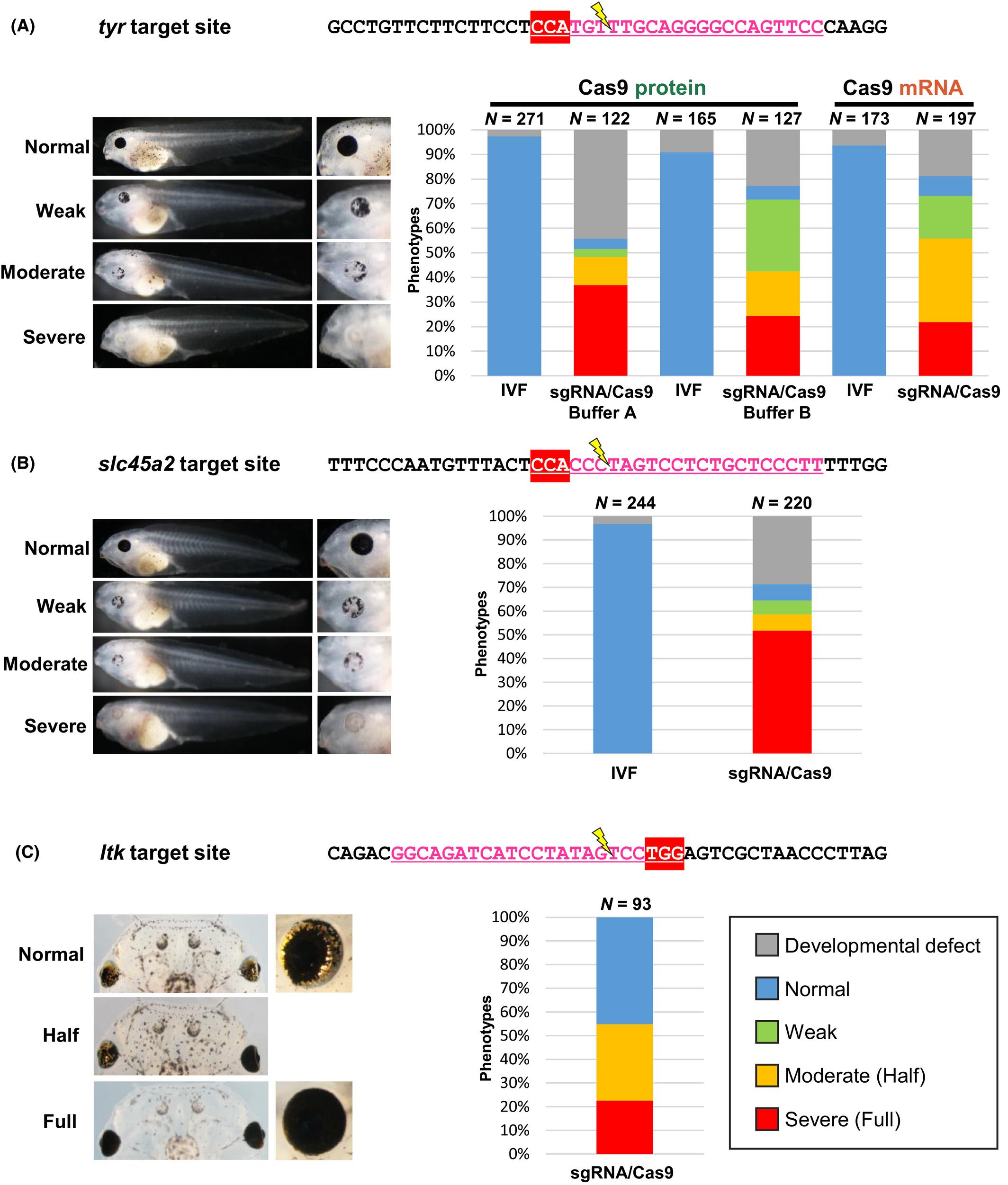 Figure 1. Targeted gene disruption of tyrosinase (tyr), solute carrier family 45 member 2 (slc45a2) and leukocyte tyrosine kinase (ltk) using Cas9 protein or Cas9 mRNA with sgRNA in Xenopus tropicalis founders. sgRNA target protospacer sequences are shown by pink letters, and protospacer-adjacent motif (PAM) sequences are shown in red boxes. (A) Disruption of tyr in founders. (Left) Representative phenotypes of tyr-disrupted embryos. Phenotypes were classified into four groups: severe, near complete loss of pigmentation in retinal pigmented epithelium (RPE); moderate, more than half of pigmentation lost; weak, less than half of pigmentation lost; and normal, no alteration in pigmentation. (Right) Frequencies of tyr-disrupted phenotypes. Injections of Cas9 protein with tyr sgRNA in buffer A or B were independently conducted three and two times, respectively. Injection of Cas9 mRNA with tyr sgRNA was independently carried out three times. (B) Disruption of slc45a2 in founders. (Left) Representative phenotypes of slc45a2-disrupted embryos using Cas9 mRNA and sgRNA. Phenotypes were classified into four groups as described for tyr phenotypes. Severe phenotype was near complete pigmentation loss. (Right) Frequencies of slc45a2-disrupted phenotypes from three independent experiments. (C) Disruption of ltk in founders. (Left) Representative phenotypes of ltk-disrupted tadpoles using Cas9 mRNA and sgRNA. Phenotypes were classified into three groups: full, the loss of iridescence in both eyes; half, the loss of iridescence in either eye; and normal, no alteration in iridescence in both eyes. (Right) Frequencies of ltk-disrupted phenotypes from two independent experiments. Total numbers of individuals are shown at the top of each graph. In vitro fertilization (IVF) indicates control embryos without injection |