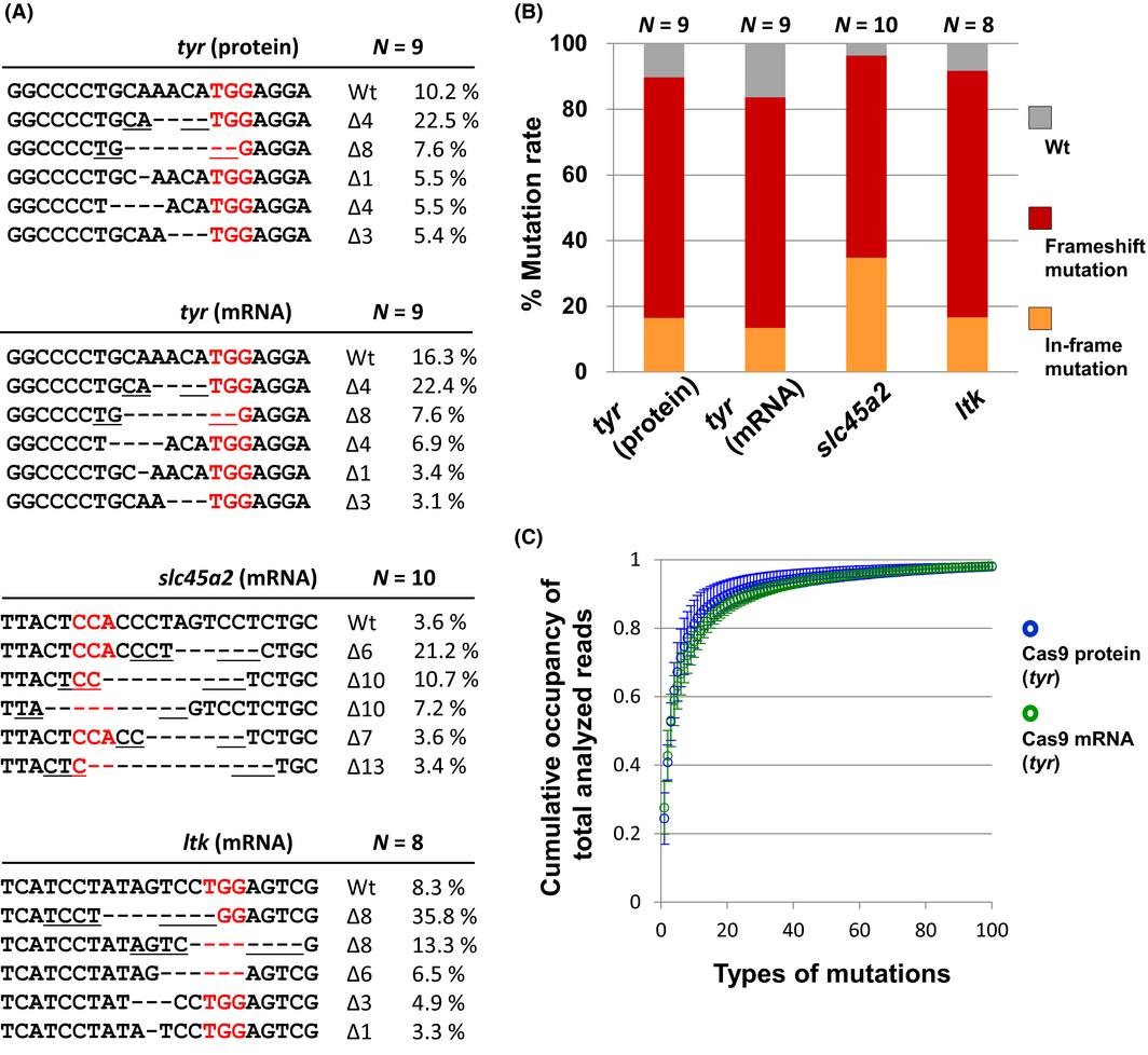 Figure 3. Traits of somatic mutations induced by CRISPR-Cas9 in the founder phenotypes. (A) The five most frequent mutant alleles among of tyr, slc45a2 and ltk in severe phenotypes. The total numbers of individuals are shown at the top of each graph. Percentages of each mutant allele to total reads are shown to the right. Protospacer-adjacent motifs (PAMs) and microhomologous sequences are indicated by red letters and underscores, respectively. Deletions are indicated by dashes. High-frequency mutant alleles were likely to have microhomologous sequences near the predicted double-stranded break (DSB) sites. (B) In-frame and frameshift mutation rates from tyr, slc45a2 and ltk in severe phenotypes. Somatic mutation rate of slc45a2 reached over 95%. Over 80% of somatic mutations were frameshift mutations in tyr and ltk. The total numbers of individuals are shown at the top of each graph. (C) Comparison of mosaicism of tyr somatic mutations between injection of Cas9 protein or Cas9 mRNA with sgRNA. Cumulative occupancy of types of tyr-mutant alleles in total analyzed reads was calculated in Cas9 protein- or mRNA-injected embryos with severe phenotypes. Fewer types of mutations imply lower mosaicism. Data points represent the mean ± SD of nine individuals in each group. The mosaicism of Cas9 protein-injected embryos was slightly lower than that of the Cas9 mRNA-injected group; however, the significant difference was marginal between both forms. These results were obtained from CIGAR strings of each allele using a custom R script. |