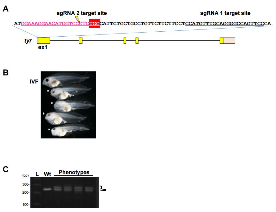 Figure S2. Phenocopy of tyr using Cas9 mRNA with another sgRNA in X. tropicalis founders and somatic mutation analysis using HMA. (A) Schematic of the genomic structure of the tyr gene and sgRNA targeting sites. Coding and untranslated exons are shown as yellow and cream coloured boxes, respectively. One (sgRNA1) was originally used in the main study, the other (sgRNA2) was made by shifting upstream from the original target site to confirm the resulting phenotypes. sgRNA target protospacer sequences are shown by pink letters and PAM sequences are highlighted in red boxes.(B) Disruption of tyr by sgRNA2 in founders. In vitro fertilisation (IVF) control embryos and representative phenotypes of tyr-disrupted embryos are shown (Asterisks). (C) Detection of targeted mutagenesis using HMA. Arrowheads and brackets indicate homoduplex and heteroduplex bands, respectively. Abbreviation; Wt, wild type. |