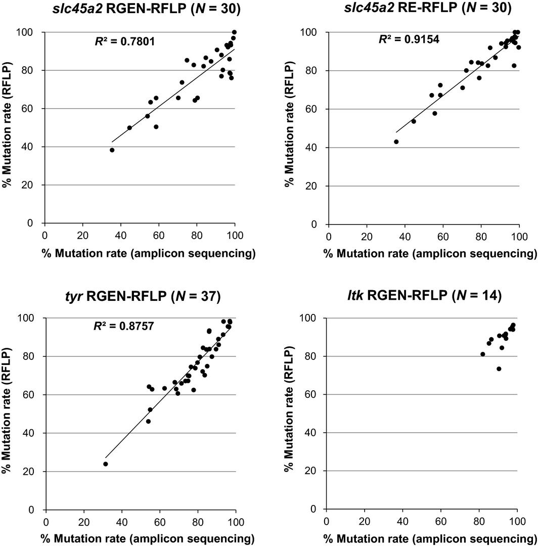 Figure 5. Correlation between somatic mutation rates determined by RFLP and amplicon sequencing analyses. The results of RE or RGEN-RFLP analysis were plotted against those of amplicon sequencing from tyr (N = 37)- and slc45a2 (N = 30)-disrupted animals with various phenotypes. In the case of slc45a2, both RGEN-RFLP and RE-digested RFLP were analyzed in parallel. Somatic mutation rates estimated by RFLP analyses exhibited a strong correlation with those determined by amplicon sequencing. In the case of ltk, although we could not statistically evaluate the association because of biased sampling (half and full phenotypes, N = 14), the results also indicate a positive association. R2 is the square of the Pearson correlation coefficient. |