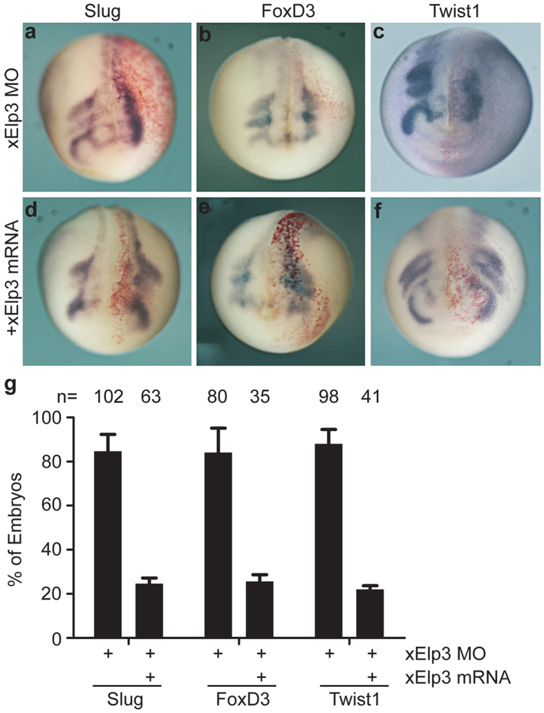 Figure 2. Knockdown of Elp3 inhibits cranial neural crest migration in Xenopus.(aâf) Elp3 MO (25âng) with or without Elp3 mRNA (0.2âng) was injected into one cell of four-cell-stage embryos, and whole-mount in situ hybridization with probes for neural crest markers was processed at St.19â21. LacZ mRNA was co-injected to trace the injected sides (stained red on the right sides). (g) Percentages of embryos with reduced migration of neural crest as shown in (aâf). The results are from three independent experiments (error bars represent SDs). |