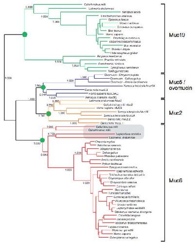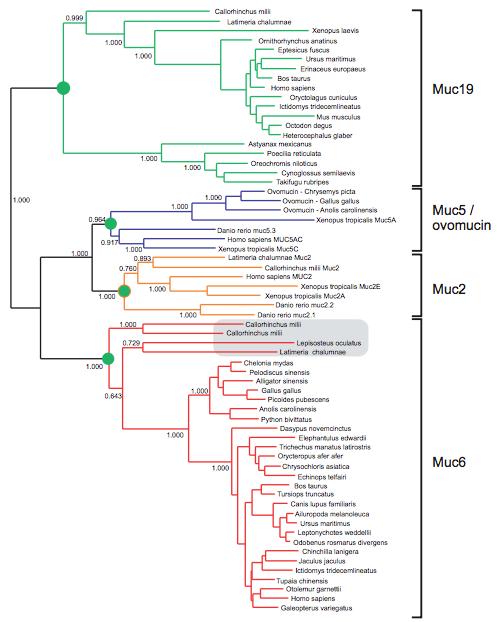 Fig. 2. The mucin Muc6 was present early in vertebrate evolution. Tree was constructed with MrBayes using an alignment of the N-terminal parts of mucins that include the three VWD–C8–TIL units. Homologs of Muc19, Muc6, Muc5, ovomucin, and Muc2 are shown. Critical nodes are labeled with green circles. The four Muc6 homologs of C. milii, L. chalumnae, and Le. oculatus clearly belong to the group of Muc6. |