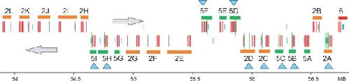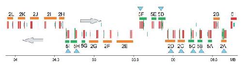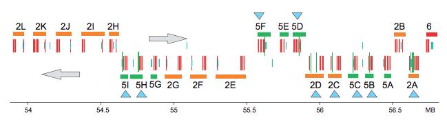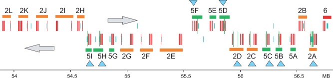 Fig. 3. Genomic organization of X. tropicalis mucins. Genomic region from assembly version 7, accession KB021653.1, region 53,600,000–57,000,000 is shown. Genes are shown for Muc5 paralogs (green) and Muc2 paralogs (orange). Naming of genes was based on their location from right to left. Location of VWD domains, PTS domains, and CysD domains (red, blue, and green vertical bars, respectively) are based on the analysis of the genomic sequence with genewise and an in-house Perl script. Genes where a CysD domain is predicted are indicated with cyan triangles. |
