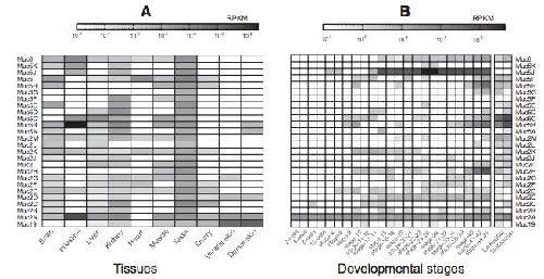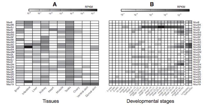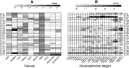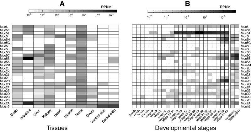 Fig. 4. X. tropicalis mucin gene transcription. A total of 26 different mucin genes were analyzed with respect to gene expression. Expression levels (RPKM) were estimated from public RNA-Seq data as listed in supplementary dataset S2, Supplementary Material online, and as described in more detail in Materials and Methods section. (A) Expression in different tissues. (B) Expression at different developmental stages. |
