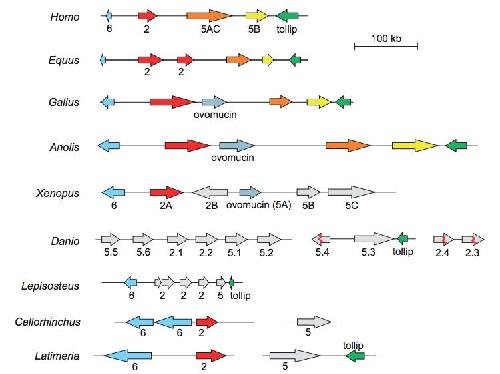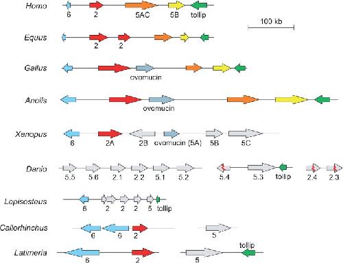 Fig. 5. A conserved structure of mucin genes in vertebrates. Arrows reflect the strand polarity. In the case of X. tropicalis only a part of a larger cluster of mucin genes is shown (see also fig. 3). |