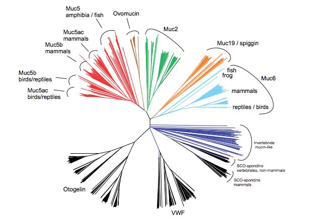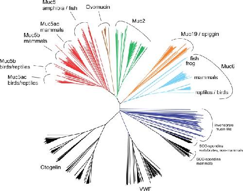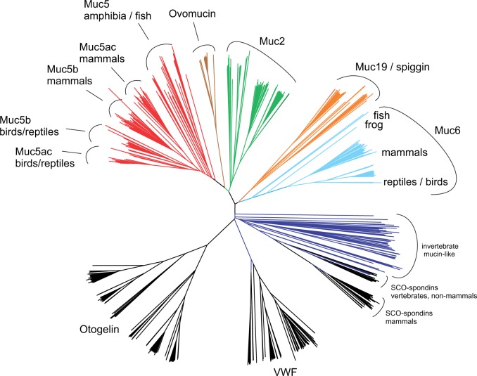2002). Highlighted in color are Muc5 (red), ovomucin (brown), Muc2 (green), Muc19/spiggin (orange), Muc6 (cyan), and invertebrate mucin-like