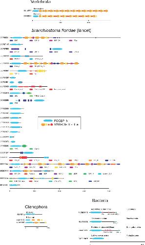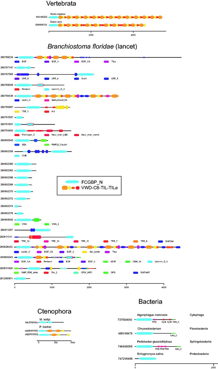 Fig. 7. Domain structures of selected proteins with a domain characteristic of FCGBP. In vertebrates, FCGBP proteins have a large number of VWD–C8–TIL units, in addition to the FCGBP_N domain. In the invertebrate B. floridae, there is a large number of proteins with the FCGBP_N domain. All domains that are not FCGBP_N, VWD, C8, TIL, TILa, or PTS domains are explained below each representation of protein domain architecture. For a complete collection of all proteins with the FCGBP domain, see supplementary figure S5, Supplementary Material online. |
