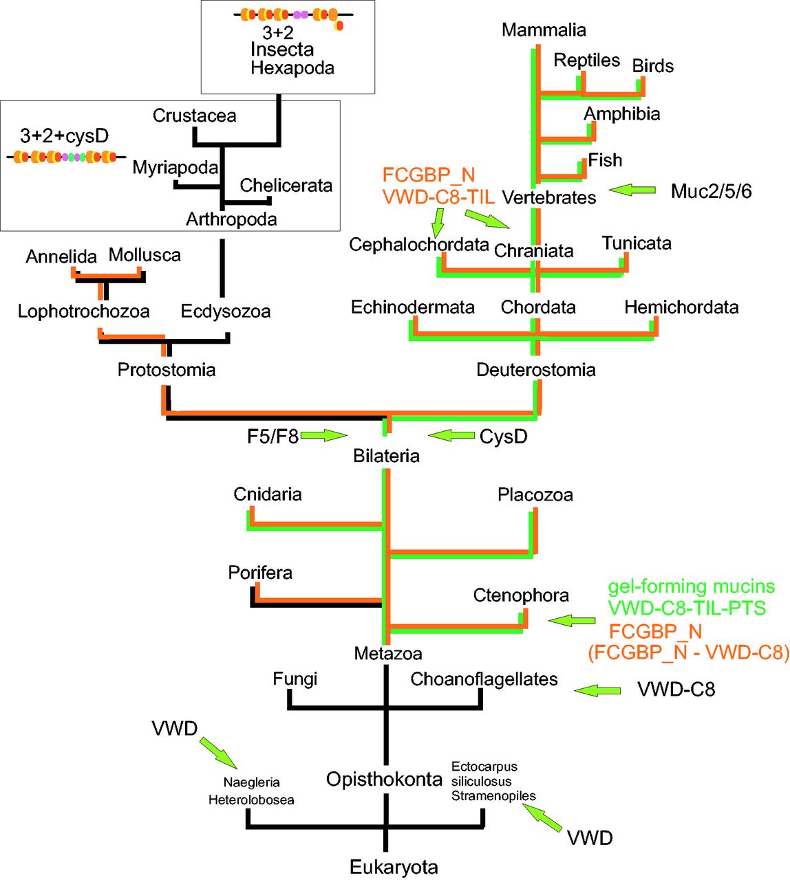 FIG. 8 Summary of mucin and FCGBP protein evolution. The VWD domain seems to occur in a restricted number of protists, but not in combination with the C8 or TIL domains. The combination of VWD/C8 appears in choanoflagellates and the structure characteristic of gel-forming mucins as well as the FCGBP_N-containing proteins appear in Ctenophora. The F5_F8 and CysD domains occur in Bilateria. A protein with FCGBP_N and multiple VWD–C8–TIL domains appears later in evolution as it is observed only in cephalochordates and vertebrates. |