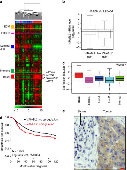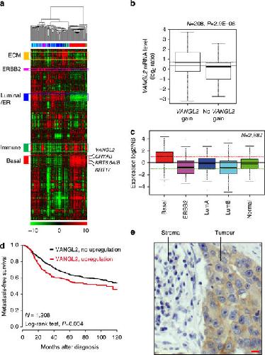 Figure 1. Overexpression of VANGL2 in breast cancer.(a) Hierarchical clustering of the 208 breast cancers and 4 NB samples (columns) and the 12,304 most variable genes (rows). According to a log2 pseudocolour scale (bottom), red indicates a high level of mRNA expression compared with the median value across all samples, whereas green indicates a low level of expression. The magnitude of deviation from the median is represented by the colour saturation. The dendrogram of samples (above matrices) represents overall similarities in gene expression profiles. To the left of the colour matrix are represented some biologically relevant gene clusters (orange: extracellular matrix cluster (ECM); pink: ERBB2 cluster; blue: luminal/ER cluster; green: immune cluster; red: basal cluster). A few genes of the basal cluster are shown, including VANGL2, as well as classical basal genes (KRT5, KRT6, KRT17 and CRYAB). (b) Box and whisker plots of VANGL2 expression across 208 breast cancer samples profiled by both expression DNA arrays and aCGH, and according to (Student's t-test) VANGL2 genomic status: with (left, 104 samples) versus without (right, 104 samples) gain defined as a DNA copy number ratio tumour/NB⩾1.5). (c) Box and whisker plots of VANGL2 expression across 2,687 breast cancer samples according to molecular subtypes. Expression values are NB-centred. The horizontal black line represents the level of expression of VANGL2 in NB tissue. Differences between the subtypes were tested for significance using one-way analysis of variance (ANOVA). For each box and whisker plot, the median value and interquartile ranges are indicated. (d) KaplanâMeier MFS curves in breast cancer patients according to VANGL2 mRNA expression. The 5-year MFS are 55% (upregulation; N=296) and 64% (absence of upregulation; N=912). (e) Immunohistochemistry experiment using anti-VANGL2 2G4 monoclonal antibody (mAb) shows that VANGL2 is more expressed in tumour cells (tumour) than in the stromal tissue (stroma) in basal breast cancer. Scale bar, 10âμM. |