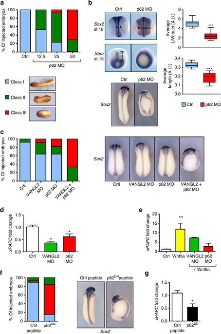 Figure 6. p62/SQSTM1 is necessary for VANGL2 pathway-mediated in vivo morphogenesis.(a) Two-cell embryos were injected in each blastomere with 12.5 (n=15), 25 (n=13) and 50 (n=104) ng of p62 MO. Morphology was analysed at tailbud stage. (b) Embryos injected with 50âng of p62 MO were processed for WISH analysis at mid-neurula and late gastrula stages. Convergence extension in the neural tube of late neurula embryos was evaluated by the average length/width ratio of the Sox2 domain (n=17). Convergence extension in the axial mesoderm of late gastrula embryos was evaluated by the average length of the Xbra domain (n=16). Tailbud embryos were stained with the Sox2 probe to highlight neural tube defect (bottom panel, n=30 control, n=104 morphants). (c) Two-cell embryos were injected in each blastomere with 11.5âng of VANGL2 MO (n=27), 8âng of p62 MO (n=26) or 11.5âng of VANGL2+8âng of p62 MO (n=32). Morphology was analysed at the tailbud stage using criteria of a. These embryos were processed for analysis of Sox2 expression at the tailbud stage (n=3). (d) Ten embryos injected as in b or with 34.5âng of VANGL2 MO in each blastomere were collected at stage 13 and processed for RTâqPCR. (e) Four-cell embryos injected with Wnt5a mRNA (30âpg per cell) in the animal pole received a second injection of VANGL2 (11.5âng per cell), or p62 (12.5âng per cell) in all animal blastomeres at eight-cell stage. Fifteen animal caps per condition were isolated at the blastula stage, cultured for 4âh (at 23â°C) and then processed for RTâqPCR. (f) Two-cell embryos were injected in each blastomere with 4.5âng of control peptide (n=27) or p62DN peptide (n=26). Morphology was analysed as in a and processed for analysis of Sox2 expression at the tailbud stage. (g) Ten embryos injected as in f were collected at stage 13 and processed for RTâqPCR. For qPCR graphs, error bars represent s.e.m. values of three or more independent experiments with two technical duplicates. Statistical analyses used unpaired Student's t-test, except in e where one-way ANOVA with Dunnett's test (99.9% confidence intervals) were applied. *Pâ¤0.05; **Pâ¤0.005; ***Pâ¤0.0005; Ctrl, control; MO, morpholino; mRNA, messenger RNA; RTâqPCR, reverse transcriptaseâquantitative PCR; WISH, whole-mount in situ hybridization. |