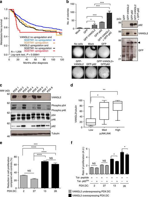 Figure 7. Disruption of the VANGL2âp62/SQSTM1 interaction in breast cancer cells.(a) KaplanâMeier MFS curves of breast cancer patients according to concomitant VANGL2 and p62/SQSTM1 mRNA expression. The 5-year MFS are 49% (both upregulated; N=27), 64% (both not upregulated; N=833) and 56% (one upregulated, the other not upregulated; N=79 and N=269). (b) Soft agar colony formation of T47D cells overexpressing GFP, GFPâVANGL2 and GFPâp62/SQSTM1 (right). Protein expression was revealed with anti-p62/SQSTM1, anti-VANGL2 and anti-GFP antibodies by western blot analysis (right). In anti-GFP blot, the arrowhead indicates position of co-migrating GFPâVANGL2 and GFPâp62/SQSTM1 and the asterisk pinpoints GFP alone. Error bars represent mean±s.d. (n=3). (c) Protein levels of VANGL2, phosphorylated JNK, JNK (p54/p46), p62/SQSTM1 and tubulin assessed in eight breast cancer PDXs (PDX 1â8) by western blot analysis. (d) VANGL2, JNK, phosphorylated JNK and tubulin signals from 30 PDX protein extracts were quantified. VANGL2/tubulin ratios were plotted against pJNK/JNK ratios, arranged in ascending order into three equally sized groups (low, medium and high). High expression of VANGL2 protein is correlated to high levels of phosphorylated JNK. Box and whisker plots show the median value and interquartile ranges. The KruskalâWallis test was used for comparison of the median levels of expression. Statistically significant differences are indicated (*Pâ¤0.05; **Pâ¤0.01). (e) Treatment of the indicated PDX-derived cells (PDX. DC-2, â27, â13 and â26) with a Tat-conjugated JNK inhibitor (Tat-JIP at 10âμM) during 48âh led to greater reduction in cell proliferation of VANGL2high/pJNKhigh than VANGL2low/pJNKlow PDX-derived cells. Comparisons use Tukey's multiple comparisons test. NS, not significant. Data are representative of three independent experiments; *Pâ¤0.05; **Pâ¤0.01; ***Pâ¤0.001; ****Pâ¤0.0001. (f) Treatment of the indicated PDX-derived cells (PDX. DC-2, â27, â13 and â26) with the p62DN peptide (225âμM) but not with control scrambled peptide (225âμM) during 48âh resulted in decreased cell proliferation of VANGL2high/pJNKhigh, but not VANGL2low/pJNKlow, PDX-derived cells. Data are representative of three independent experiments and statistical testing as stated in e. |