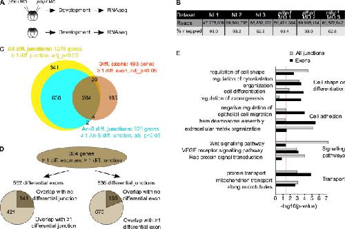 Fig. 2. Comparison of the exon-centric and junction-centric approaches to identify differential splicing patterns in Xenopus laevis. A, RNAseq was carried out from 3 independent pools of stage 28 embryos injected with the morpholino against ptbp1 mRNA (ptbp1 MO), or left uninjected. B, Table summarizing RNAseq data. â% mappedâ is to the percentage of read pairs uniquely mapped to the Xenopus genome (v9.1). C, Venn diagram showing the overlap of the genes with at least one differential exon, the genes with at least one annotation-supported differential junction, and the genes with at least one differential junction. D, For the 304 (284+20) genes with at least one differential exon and one differential junction, we indicate the numbers of differential exons and junctions. The pie charts show the percentage of differential exons associated with one differential junction (left), and the percentage of differential junctions associated with one differential exon (right). E, Comparison of enriched GO terms in differentially spliced genes identified by the junction-centric and the exon-centric approaches. The dotted red line indicates p=0.05. The GO terms are on the left, and we clustered the enriched GO terms in 4 main classes (right). |