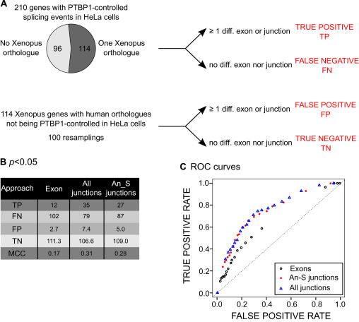 Fig. 3. Assessment of exon-centric and junction-centric performances. A, Pie chart showing the number of identified Xenopus orthologues of human genes with splicing events controlled by PTBP1 (Llorian et al., 2010). We classified the 114 Xenopus genes as True Positive (TP) when at least one (Llorian et al., 2010). We classified the 114 Xenopus genes as True Positive (TP) when at least one differential exon or junction was identified in our experiments, and as False Negative (FN) when no differential exon or junction was identified. Conversely, we sampled 100 times 114 Xenopus genes the human orthologues of which are not regulated by PTBP1, and we classified them as False Positive (FP) when we retrieved them in our experiments, and as True Negative (TN) otherwise. The numbers of FP and TN in the following panels are means of the repeated samplings. B, Number of TP, FN, FP and TN, and Matthews correlation coefficient (MCC) in the exon-centric, the annotation-supported junctions approach, and the all junctions approach, with an adjusted p-value threshold set at 0.05. C, ROC curves for different p-value thresholds (0.05 steps). |