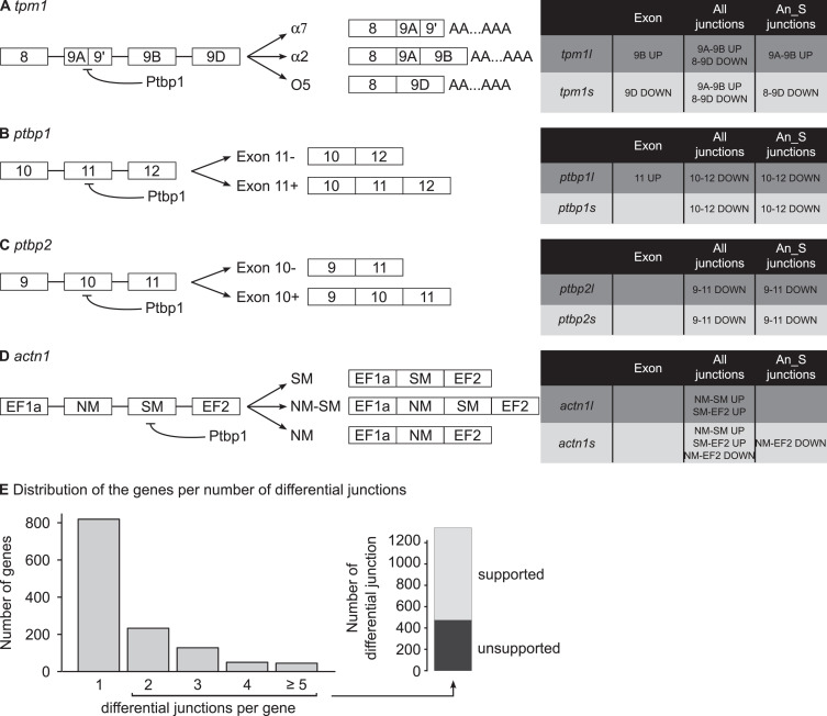 Fig. 5. Analysis of genes known to be regulated by Ptbp1 in Xenopus. A, tpm1 ( Hamon et al., 2004), B, ptbp1 ( Méreau et al., 2015), C, ptbp2 ( Méreau et al., 2015), D, actn1 ( Le Sommer et al., 2005). Left, for each gene, the Ptbp1-repressed exon and the genomic region encompassing it, as well as the different RNA processing patterns, are diagrammed. Introns are represented as horizontal lines and exons as boxes. Right, tables summarizing the exons and junctions identified as differential in ptbp1 morphants by either of the three approaches. Due to Xenopus laevis tetraploidization, each gene is present as two pseudo-alleles indicated âlâ and âsâ. E, Number of genes with the indicated numbers of differential junctions retrieved by the all-junction approach (left part). Number of differential junctions, among the genes harboring at least 2 differential junctions, supported or not by another differential junction (right part). |