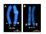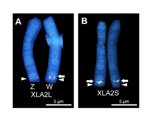 Supplementary Fig. 3. FISH mapping of BAC clones to chromosome 2L and 2S in X. laevis. The W-specific XLB1-344G18 (Green) was only localized to the long arm of the W chromosome (one of the homologous pair of XLA2L), and XLB1-075O03 (red) was mapped to distal to XLB1-344G18 (A). The XLB1-225F07 (green) was co-localized to the long arm of XLA2S with XLB1-238G02 (pseudo-colored yellow), and hybridization signals of XLB1-139P21 (red) were observed distal to these two clones (B). |