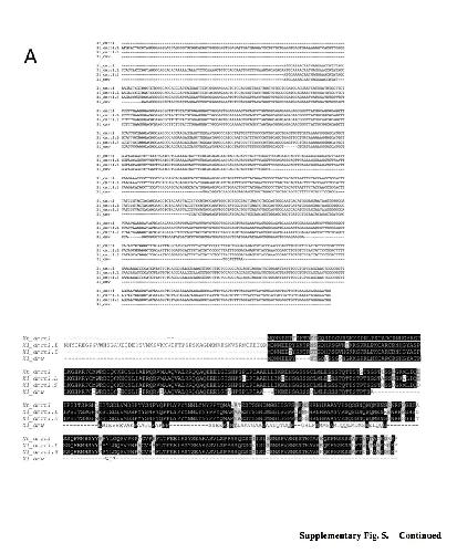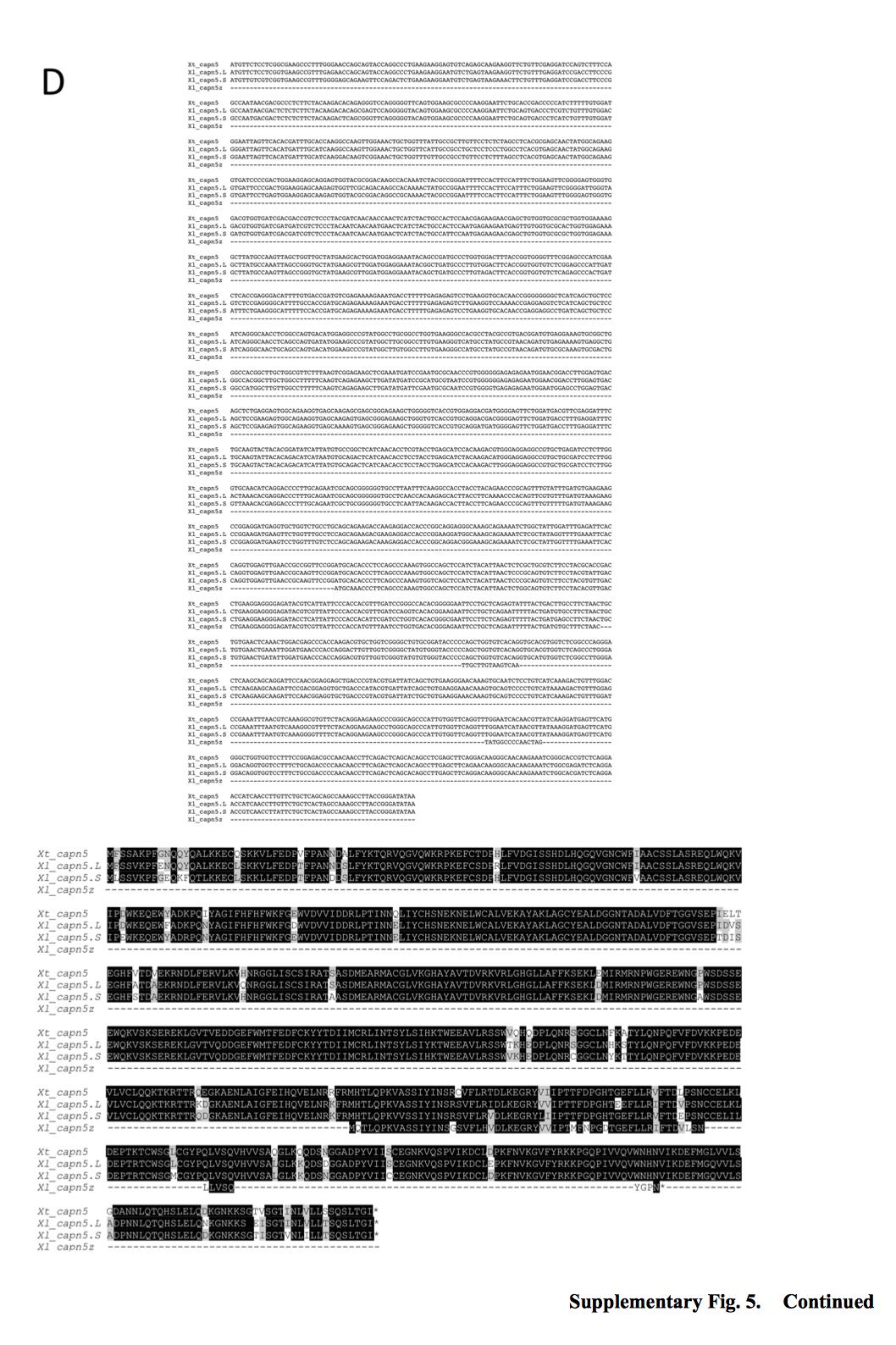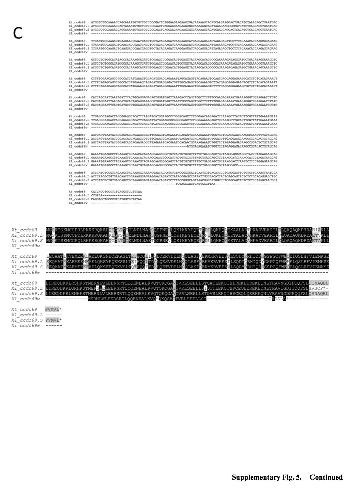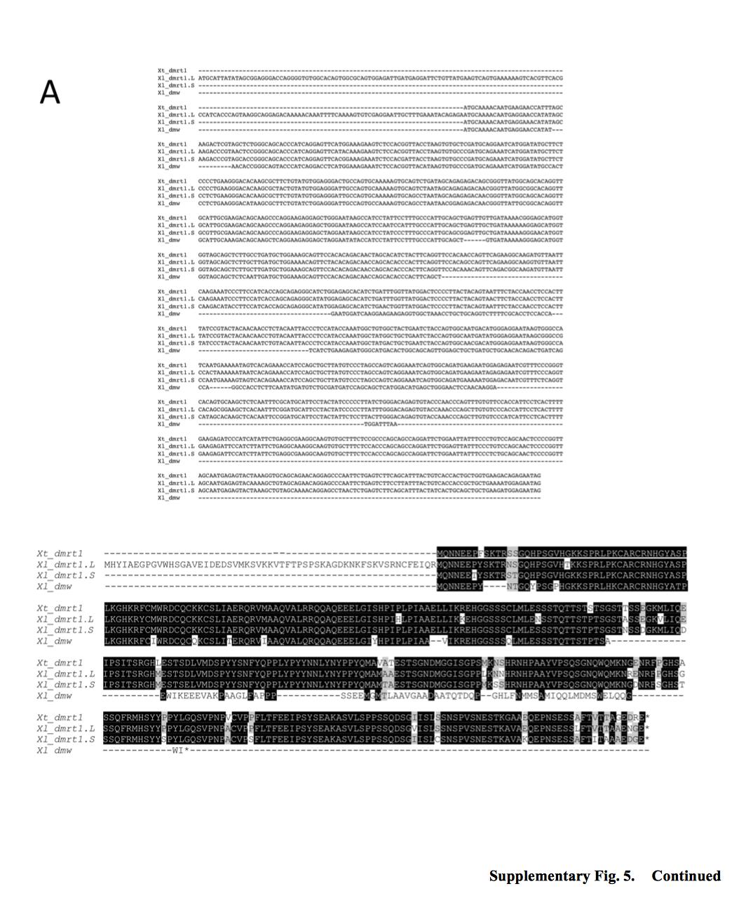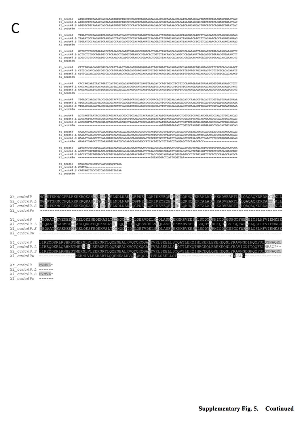 Supplementary Fig. 5. Sequence alignments among each of four X. laevis W/Z-specific coding sequences (CDSs) or their deduced amino acid sequences (AA seqs) and each of its homologous CDSs or AA seqs, respectively, in X. laevis and X. tropicalis. The alignments are shown among dmw and dmrt1s (A), scanw and scans (B), ccdc69w and ccdcc69s (C), and capn5w and capn5s (D). Identical AA residues in more than three or only two among four proteins are represented by white letters in black background or black letters in grey background, respectively. * indicates a stop codon. Note that there are three stop codons in the deduced amino acid sequence of X. tropicalis Scan, indicating that Xt Scan is a psuedogene. |