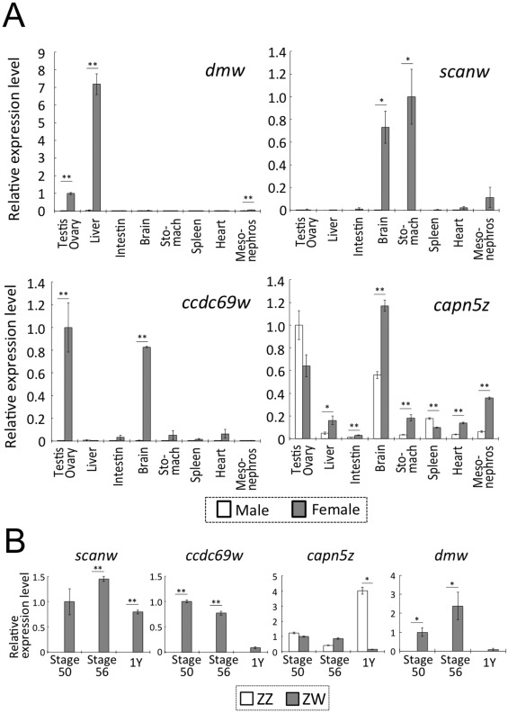 Fig. 4. Expression of the W/Z-specific genes in various adult organs and developing gonads from ZZ and ZW individuals. Real-time PCR analyses of dmw, scanw, ccdc69w, and capn5z were performed using cDNA derived from the total RNA in sexually mature adult organs from J strain (A) and developing gonads at stage 50 immediately after sex determination, as well as at stage 56 (early sex differentiation) and at 1 year old (1Y, sexually mature gonads) from the wild type tadpoles and adults (B). The expression of ef1α was used for normalization. Values are the mean ± s.e. based on three individual experiments. *: P<0.05;**: P<0.01 by unpaired two-tailed t-test. |