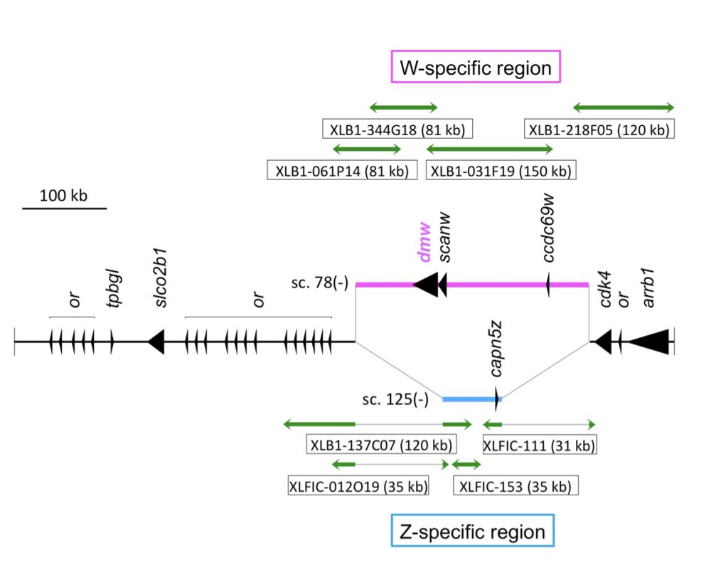 Supplementary Fig. 1. Schematic representation of fully sequenced BAC and fosmid clones in the W/Z-specific loci of X. laevis. Green double-headed arrows indicate the regions of the fully sequenced BAC and fosmid clones. XLB1 and XLFIC correspond BAC and fosmid clones, respectively. Magenta and cyan lines represent W- and Z-specific regions, respectively. Triangles indicate genes and the tips correspond to their 3′ ends. or, olfactory receptor gene. |