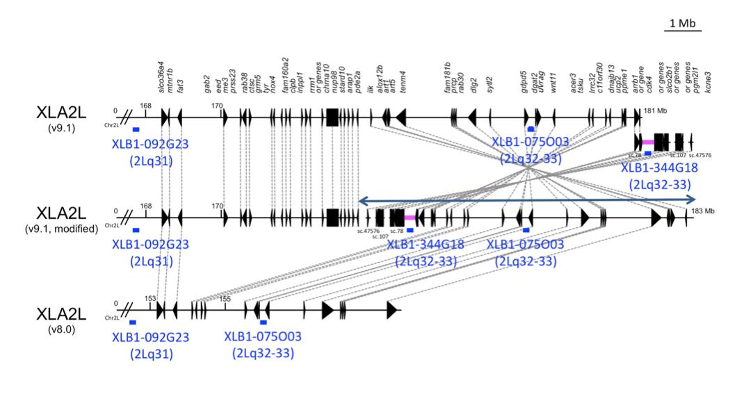 Supplementary Fig. 2. Synteny analysis of XLA2L (q32–33), which includes the W-specific sequences, in X. laevis genome v9.1, corrected X. laevis genome v9.1, and X. laevis genome v8.0. Triangles indicate genes and the tips correspond to their 3ʹ ends. Olfactory receptor (or) gene clusters are indicated by squares. Magenta and blue lines represent the regions of the W-specific sequence and the BAC clones used in the FISH analysis, respectively. |