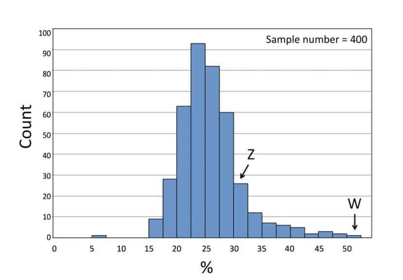 Supplementary Fig. 4. Histogram of the TE percentage to the autosomal sequences in the X. laevis genome by random sampling (sample number = 400) and the positions of the percentage in the W/Z-specific regions. Total population (N) is 2504438500, which could be the number of 250 kb fragments in the X. laevis autosomal sequences. Sample size necessary (n) was determined under the following conditions (e=0.05, P=0.5, Z=1.96, N=2504438500). Because n was 385, the TE percentage to the autosomal sequences was analyzed by random sampling (sample number = 400). The two arrows indicate the position of the percentage in Z- and W-specific regions (see Supplementary Table 3). |