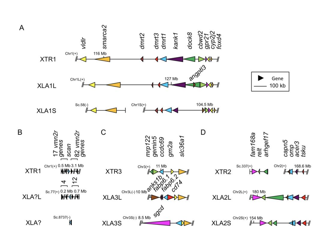 Supplementary Fig. 7. Synteny analyses of the ancestral genes of the four W/Z-specific genes in X. laevis and X. tropicalis. Synteny of dmrt1 (A), scan (B), ccdc69 (C), and capn5 (D) as ancestral genes of dmw, scanw, ccdc69, and capn5z, respectively. Triangles indicate genes and the tips correspond to their 3ʹ ends. XLA and XTR represent the chromosomes of X. laevis and X. tropicalis, respectively. sc., scaffold. |