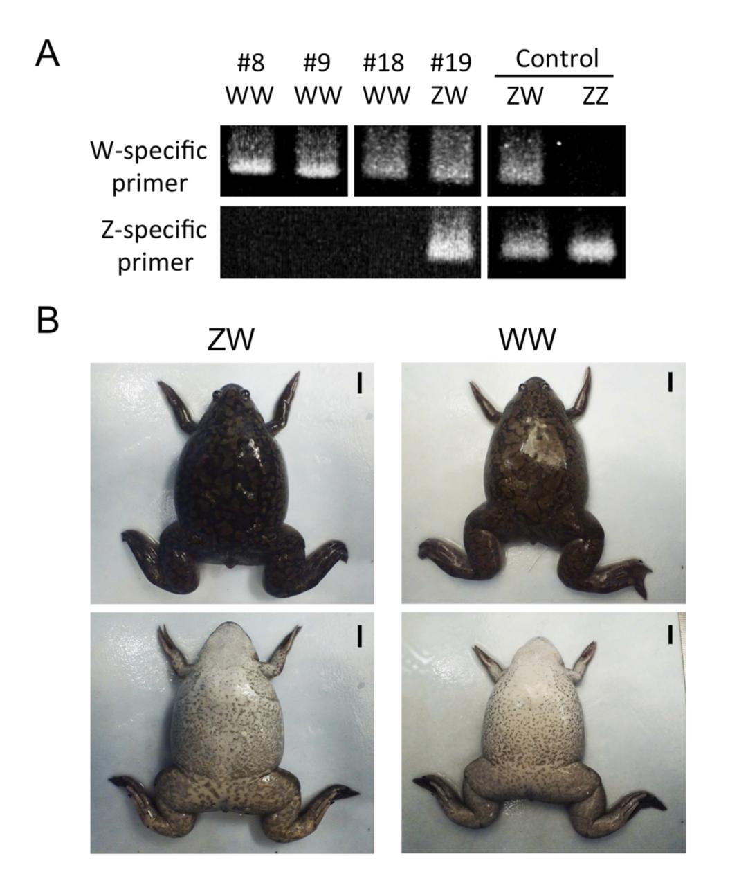 Supplementary Fig. 8. Production of diploid gynogenetic WW individuals in the X. laevis J strain. (A) Genomic PCR analysis of gynogenetic individuals. PCR was performed using genomic DNA with the W- and Z-specific primer pairs. (B) Dorsal and ventral views of gynogenetic individuals. |