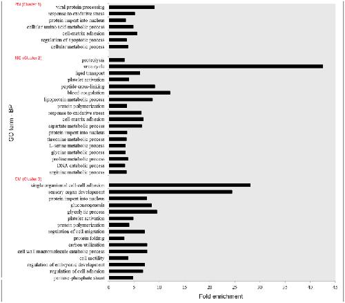 Figure 4. GO enriched processes in three key developmental stages.The significantly overrepresented (FDR < 0.05) enrichment factors of GO biological processes of the three clusters using hierarchical clustering are shown (Table S7). Only groups containing more than five genes and having a fold enrichment factor >3 are presented.