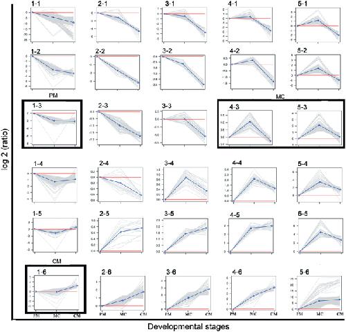 Figure 5. Clustering profiles.Plots of SOM profiles of the reduced set with their centroids highlighted in blue. Four clusters that were further analyzed for stage-specific expression patterns are marked in black boxes. The vertical axis represents the relative gene abundance, and the horizontal axis shows the three developmental stages.