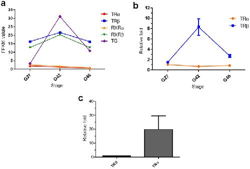 Figure 6. Expressional profiles of thyroid hormone (TH) - related genes involved in regulating metamorphosis.(a) Correlation of the expression levels of TRα, RXRα, TRβ, RXRβ and TG mRNAs with the three key developmental stages of M. fissipes. The vertical axis represents expression levels (FPKM value), and the horizontal axis represents developmental stages. (b) Expression profiles of TR genes in three key developmental stages of M. fissipes. The X axis represents the developmental stages. Lines and bars represent the means and standard errors of three individual samples (Y axis). Each experiment was performed in triplicate. (c) Comparison of the expression levels of TR genes in B. gargarizans at the PM stage. The X axis represents two TR genes. Columns and bars represent the means and standard error of three individual samples. Each experiment was performed in triplicate.